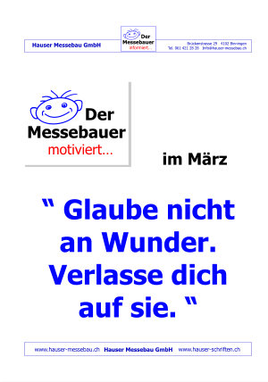 Der Motivations Slogan der Hauser Messebau aus Binningen. Möchten Sie auch jeden Monat so einen Spruch zum ausdrucken für an Ihre Pinnwand oder sonst gut sichtbar? Einfach bei uns den Newsletter anmelden unter: